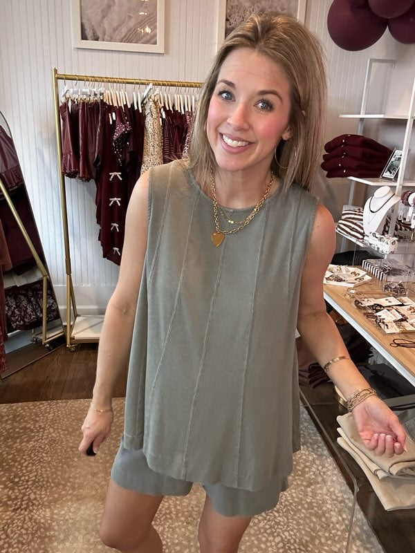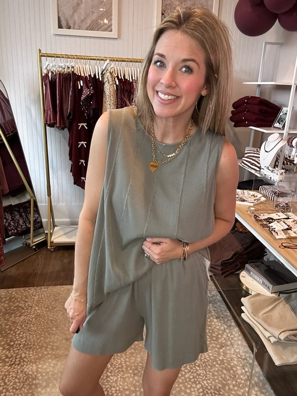Effortless and stylish, this mineral wash set features a cotton-span rib fabric for a comfortable fit. Baby doll tank with elastic waist shorts.