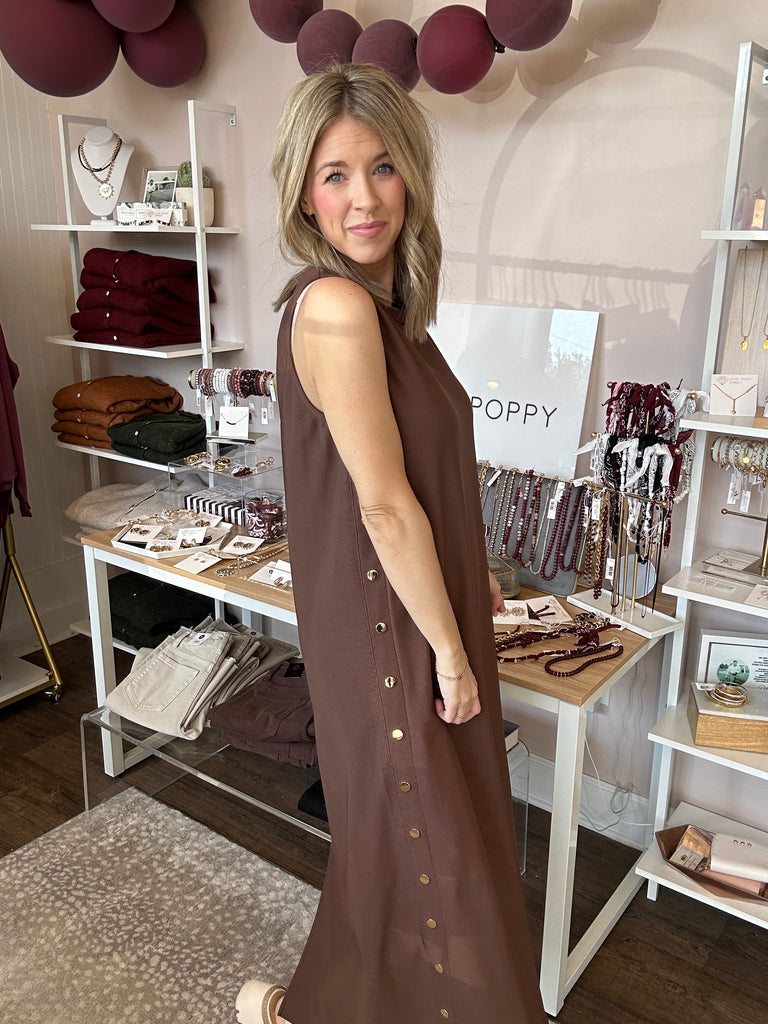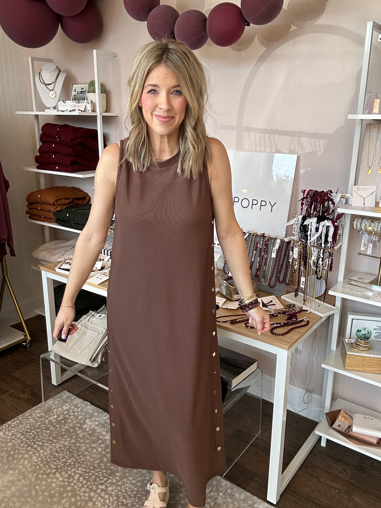 RESTOCK! Solid rib textured sleeveless pullover midi dress featuring gold accented button at side. Slit hem at back. Unlined. Knit. Non-sheer. Lightweight.