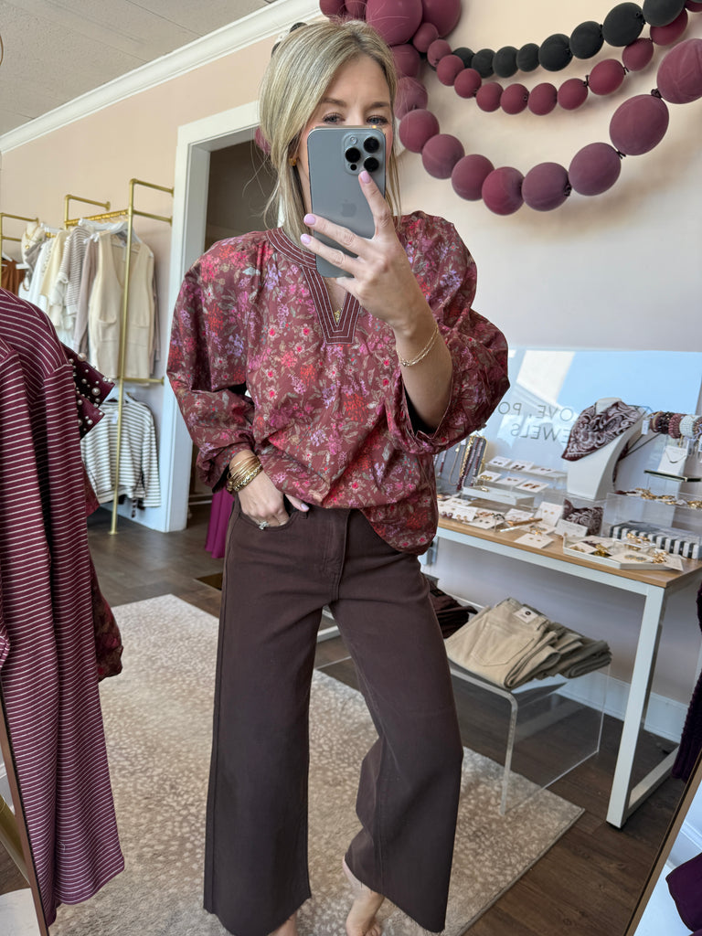 Fall Floral Top $46.99 Small - $46.99 Medium - $46.99 Large - $46.99 Quantity This variant is currently sold out Chestnut brown background with reds, greens, maroons in a beautiful floral print. Balloon sleeve with v neck collar detail. Fit: Relaxed, true to size *Chelsea is wearing a medium