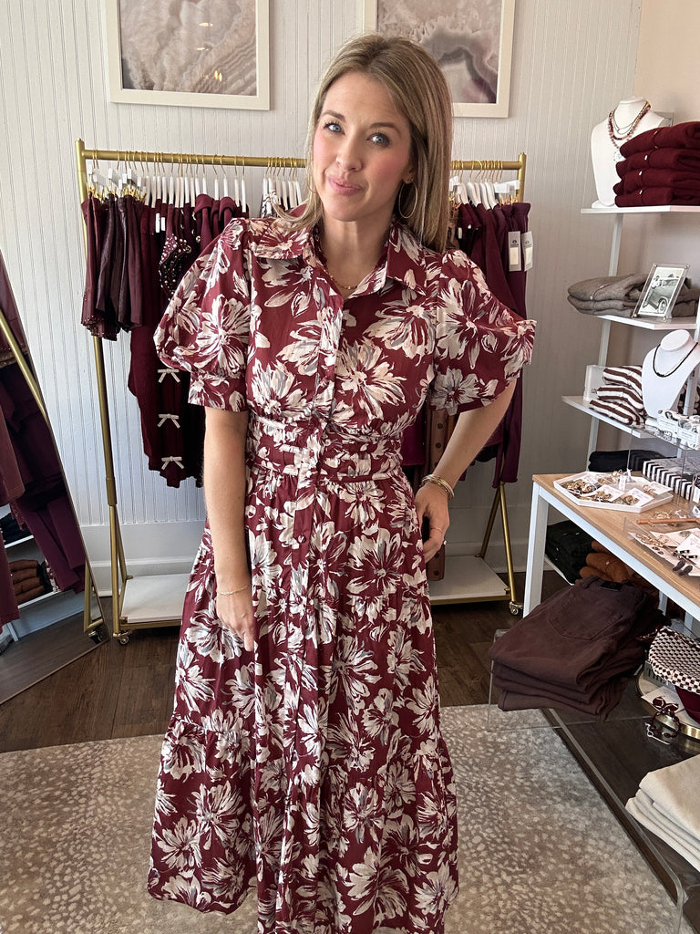 Floral pattern cuff band short puff sleeve midi dress featuring ruching accented waist front with elasticated smocking closure at back. Collar button front closure. Side pockets. Lined. Woven. Non-sheer. Lightweight.