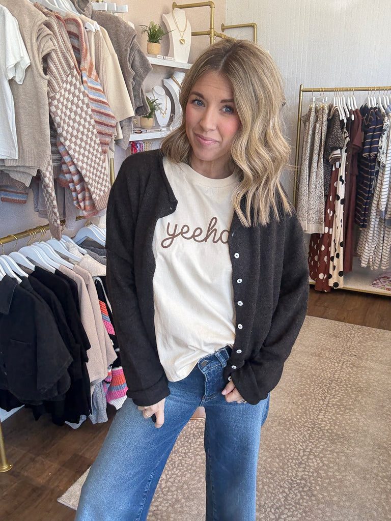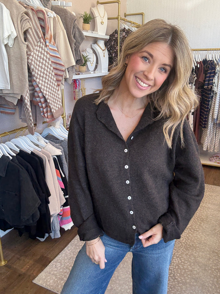 Piper Cardigan - Chocolate $49.99 Small - $49.99 Medium - $49.99 Large - $49.99 Quantity This variant is currently sold out Soft, cozy, and lightweight with rolled edge finish on the sleeves and collar. Hand washing recommended Content: 53% Recycled Polyester, 39% Acrylic, 5% Wool, 3% Spandex Fit: Roomy, relaxed fit small 2-6 medium 8-10 large 12