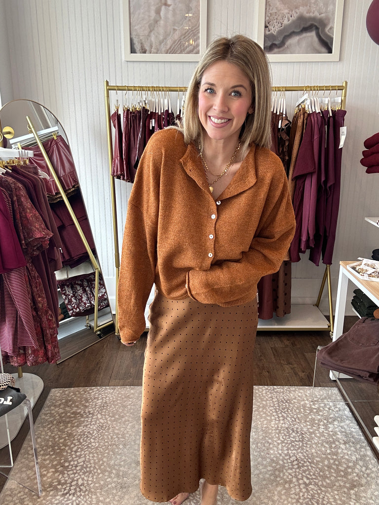 Polka Dot Satin Midi Skirt $44.99 S - $44.99 M - $44.99 L - $44.99 Quantity This variant is currently sold out Elastic back waist, lined Color: chocolate/black SMALL: TOTAL LENGTH - 34" Fabric content: 100% POLYESTER Fit: True to size small 2-4 medium 6-8 large 10