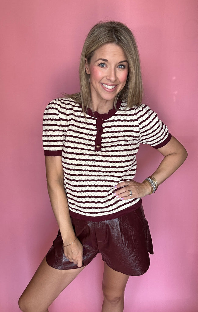 Stripe pattern short sleeve pointelle sweater knit top featuring scallop edge finish detail. Button front closure. Unlined. Knit. Semi-sheer. Lightweight.