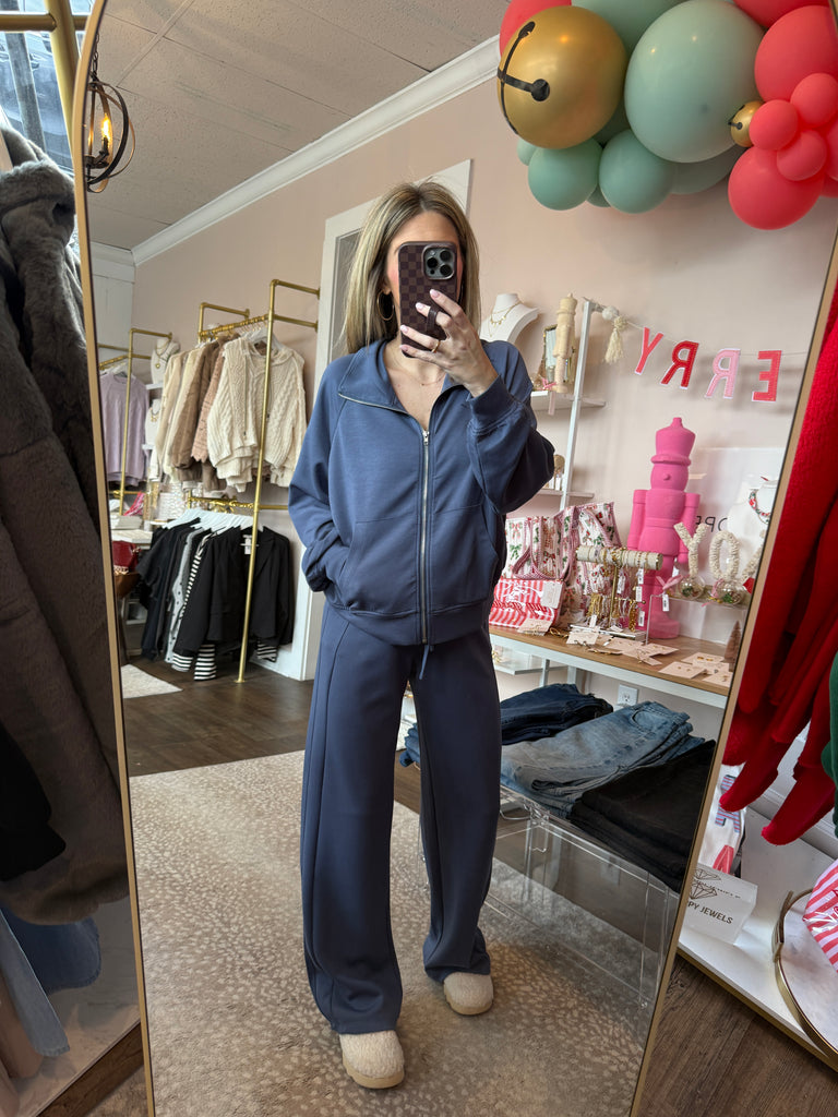 Crafted From Soft Scuba Fabric, The zip front jacket Features A Trendy High Neck That Leads To Long Sleeves With Cuffed Hems. The Relaxed Bodice Comes With A Zippered Front And A Banded Waist. These Wide-Leg Drawstring Sweatpants. Designed With A Relaxed Fit Feature A Drawstring Waist For A Customizable Fit And Convenience. The Wide-Leg Cut Provides Ample Room For Movement, Making Them Perfect For Lounging Or Casual Outings.