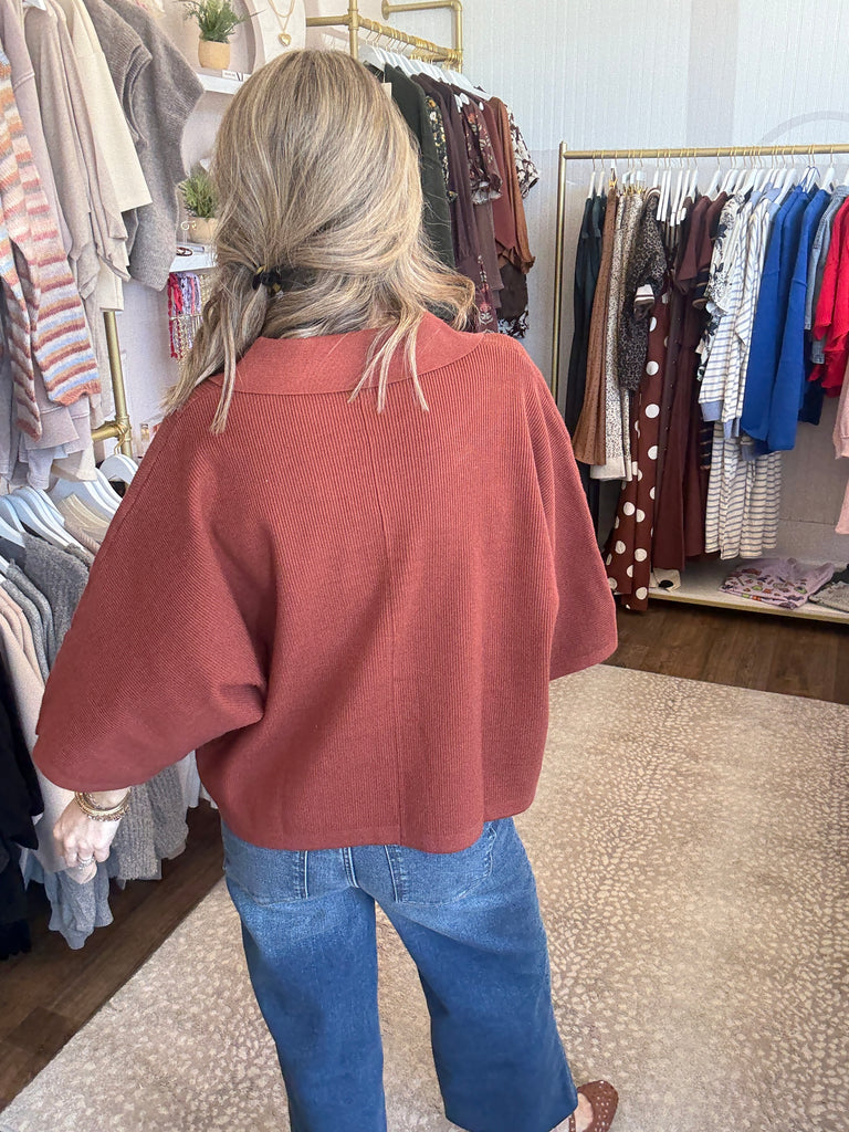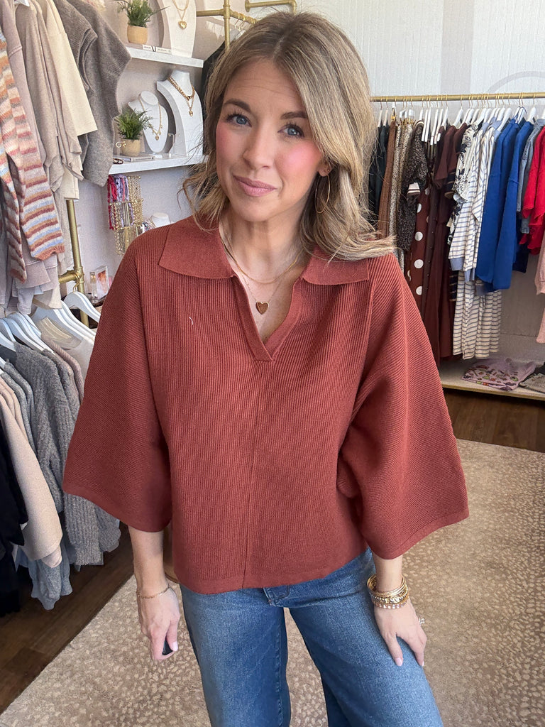 V neck collared top - rust $49.99 small - $49.99 medium - $49.99 large - $49.99 Quantity This variant is currently sold out Solid 3/4 sleeve knit top featuring open V-neck collar. Unlined. Knit. Non-sheer. Medium weight. 50%VISCOSE 30%POLYESTER 20%NYLON Fit: Relaxed small 2-6 medium 8-10 large 12