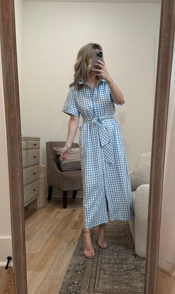Gingham short sleeve midi dress featuring ruffled collar and self-tie waist belt. Button closure at front. Side pockets. Lined. Woven. Non-sheer. Lightweight.
