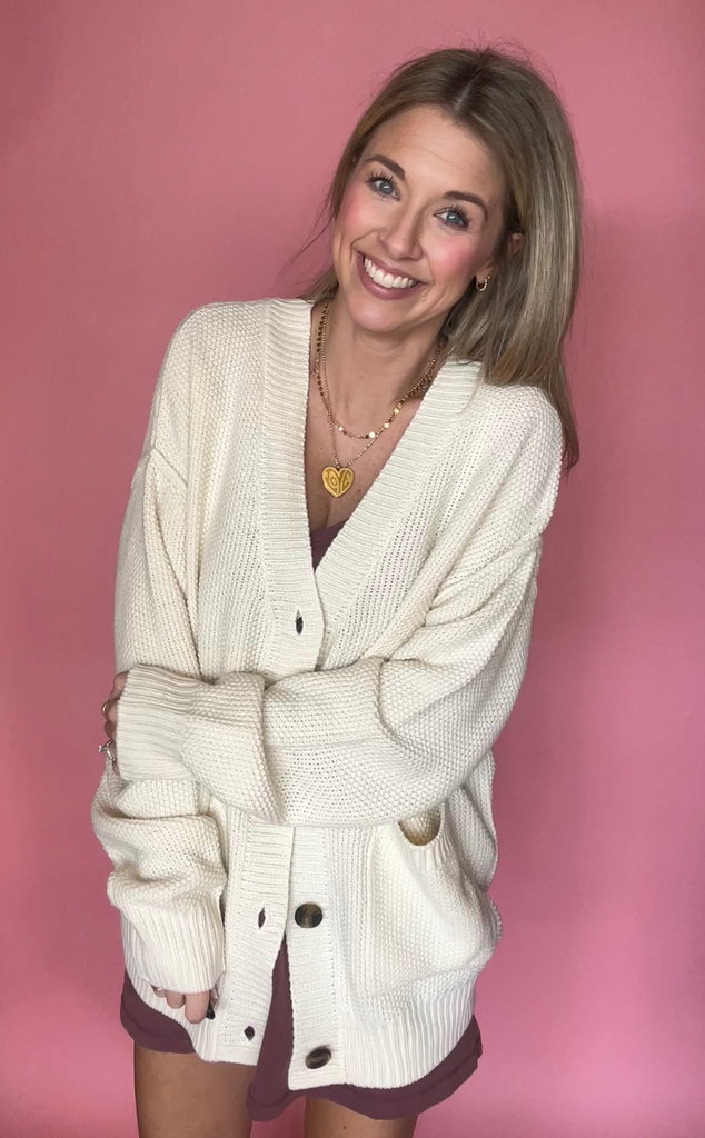 Charm Them All In This Versatile And Chic Cardigan That Is Designed Into A Relaxed Silhouette With A V-Neck, Drop Shoulders And Long Sleeves. It Is Fastened By A Button Closure Down The Center And Accented With Front Patch Pockets.