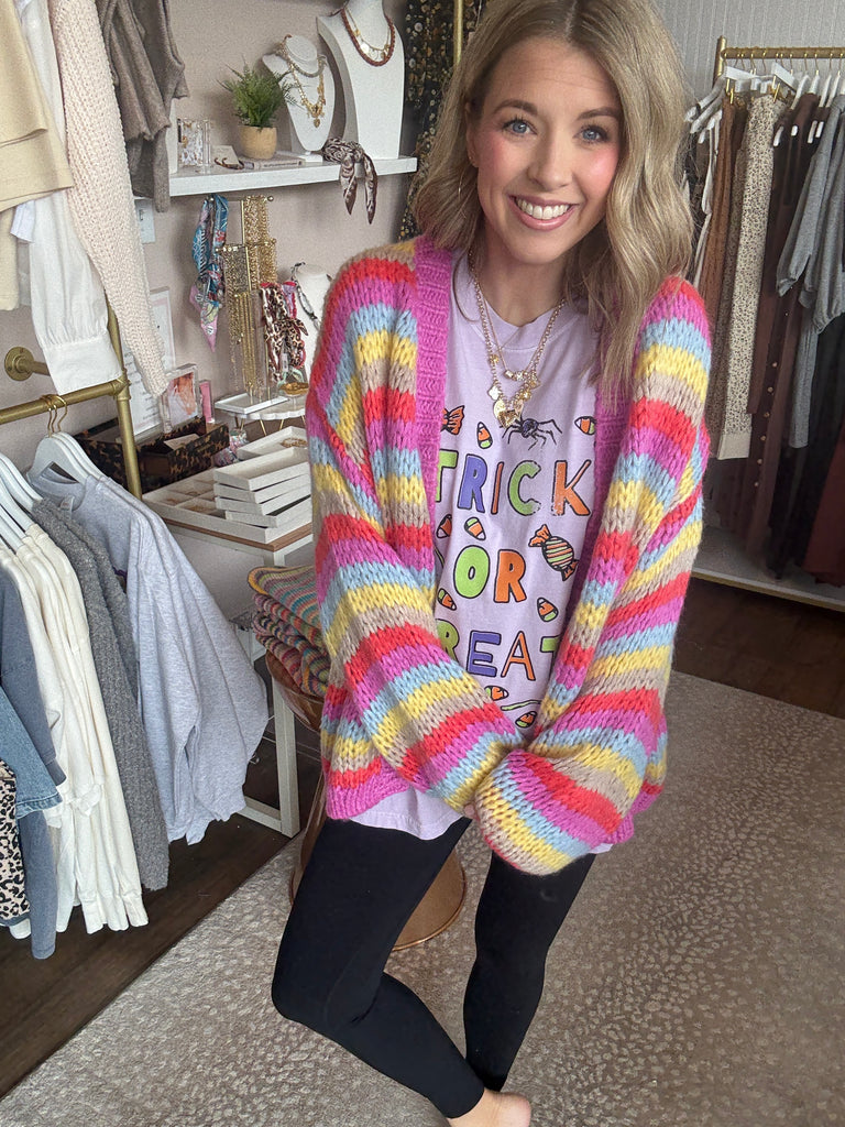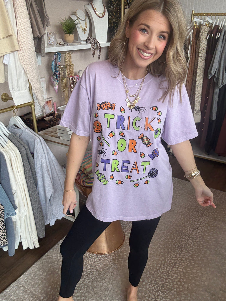 Trick or Treat Tee $42.99 Medium - $42.99 Large - $42.99 X-Large - $42.99 Quantity This variant is currently sold out Comfort colors tee, lilac color, runs like a unisex oversized tee.