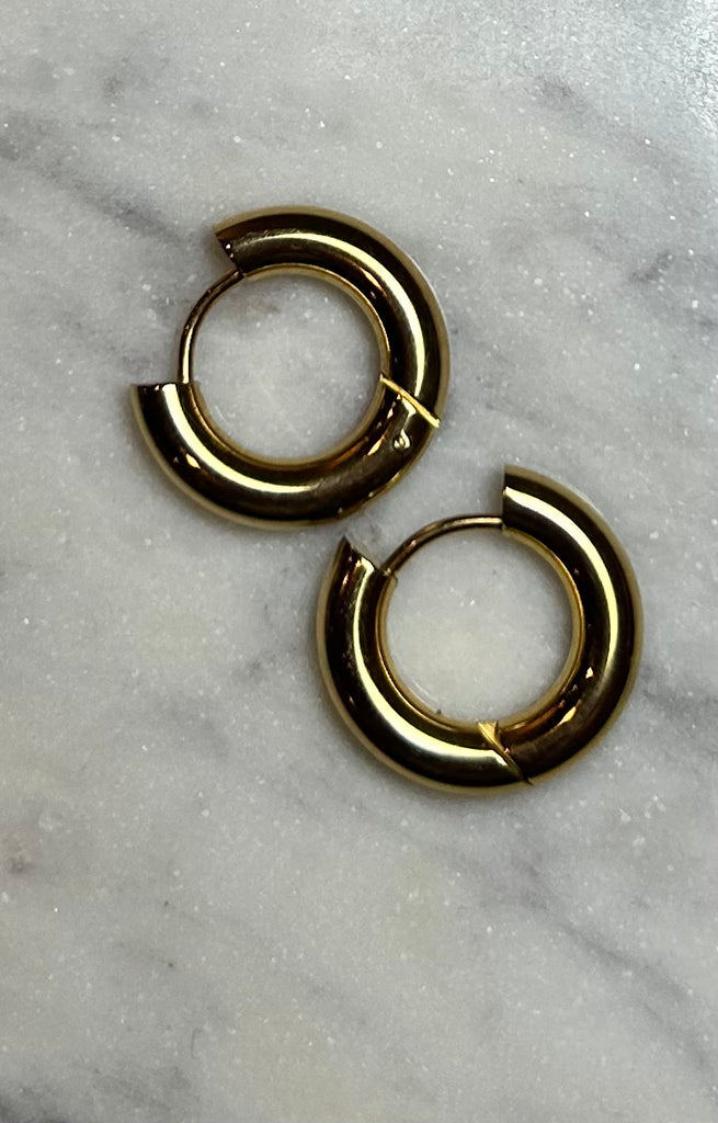 Waterproof Bold Hoop Huggie - preorder $40.00 gold - $40.00 silver - $40.00 Quantity This variant is currently sold out waterproof in gold or silver 12mm