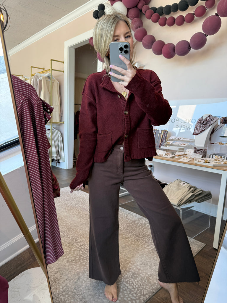 Functional button and high-low detail, boucle knit material with tortoise buttons