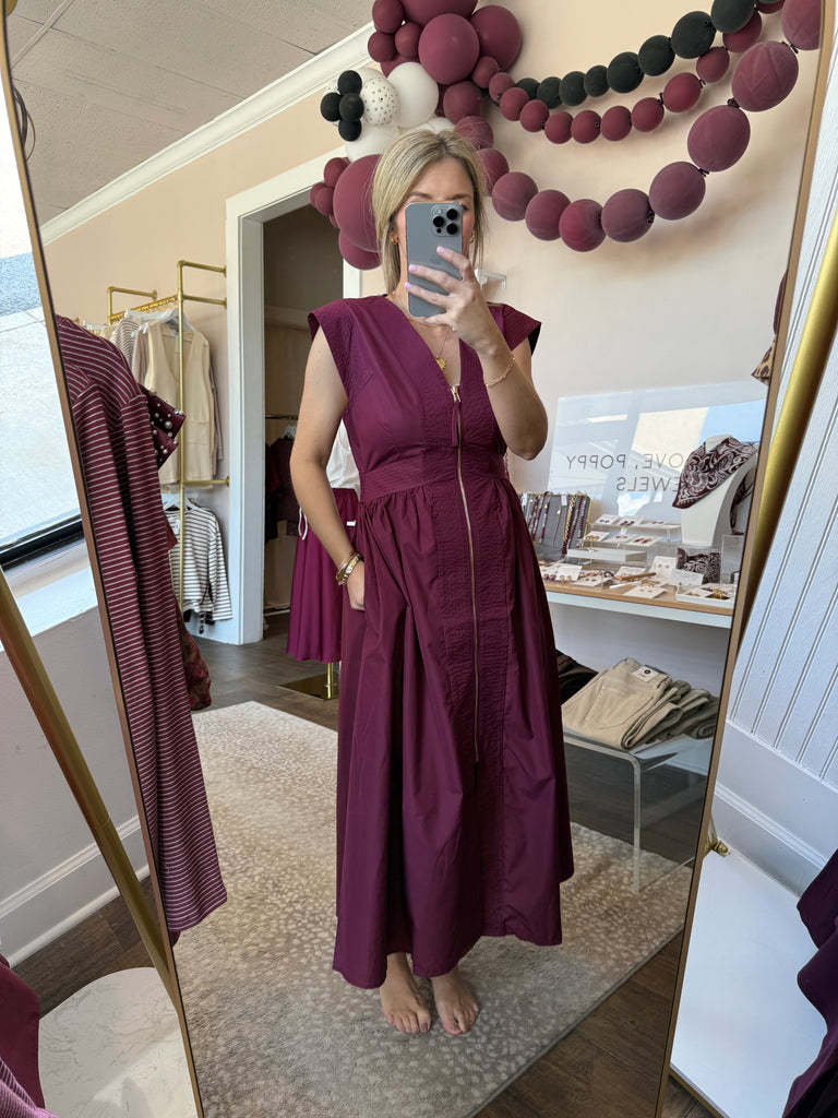 Zip-up Cap Sleeve Dress $58.99 Small - $58.99 Medium - $58.99 Large - $58.99 Quantity This variant is currently sold out Solid V-neck zip-front cap sleeve midi dress featuring textured stitching bands. Smocked waistband at back. Side pockets. Lined. Woven. Non-sheer. Lightweight. Fabric Content: 80%POLYESTER 20%COTTON Fit: True to size small 2-4 medium 6-8 large 10